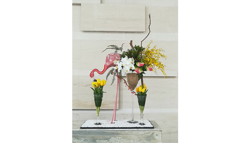 將綠植的塑形技巧帶入到盆栽設(shè)計(jì)之中,為盆栽增添個(gè)性化與設(shè)計(jì)感。纏、貼、綁……是架構(gòu)綠植中的常見技巧,欣怡園藝設(shè)計(jì)師選擇將這些技巧帶入到盆栽中。為普通乏味的植物增加趣味性與色彩,將竹節(jié)切片,紅果加入其中,整體的結(jié)構(gòu)造型與花器相呼應(yīng)。通透的材料又不會(huì)影響到盆栽植物的自然生長(zhǎng)。用鐵絲搭建出弧型架構(gòu),用盆栽土包裹在外,紫花鳳梨從中探出頭來,人工的手法下演繹著自然的造型。